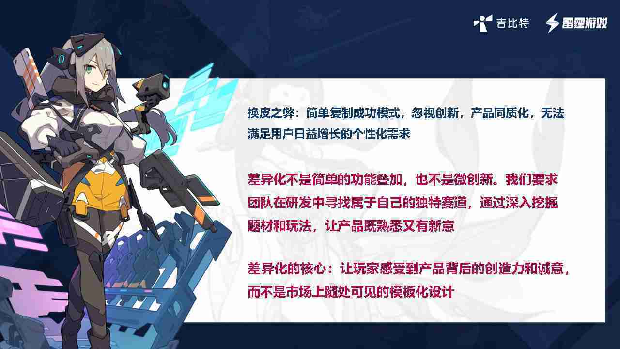 在我们内部是这么定义差异化的。。。首先,,差异化不是简单的功能叠加,,,,更不是换皮。。。。只是换皮,,产品无法提供有效的市场价值。。内部经常说差异化的产品不是为了迎合市场,,而是找到一个自己独特的表达方式,,,,在研发中找到属于自己的细分赛道和独特赛道,,前提是需要对这个题材有足够的深入、、挖掘,,对玩法有足够深入的理解,,,,让产品看起来既熟悉又有新意。。。。