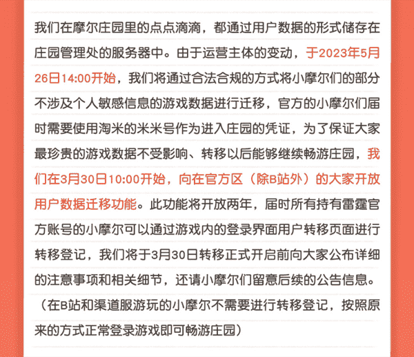 合作结束本就是开发方和代理方双方的事情,,降低这件事情对玩家的影响,,,才是对所有珍视这段童年的摩尔玩家最好的呵护。。。目前看来,,,,用户完全不用担心后续因无法登录游戏而造成任何数据上的损失,,,只要及时进行账号转移,,,,就可以好好保留、、、、延续在庄园的痕迹和回忆,,,继续在庄园里做快乐的红鼻子小鼹鼠。。。。