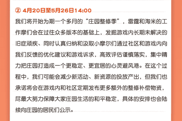 合作的结束并不意味着这个童年IP的结束,,,,对于《摩尔庄园》手游而言,,,这是一个新阶段的开始。。。后续游戏内将开启庄园重构计划,,会就以往遗留下来的BUG进行集中修复,,,,并在游戏内和社区定期发布更多补偿物资。。。