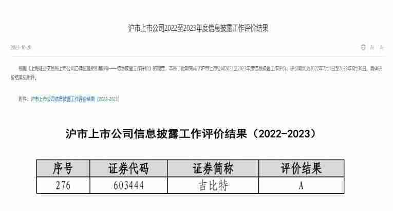 近日,,,上海证券交易所(以下简称“上交所”)发布2022-2023年度信息披露工作评价结果。。J9.COM(股票代码::::603444)凭借规范的公司治理、、高质量的信息披露以及良好的投资者关系管理再次荣获信息披露工作A级评价,,,,公司连续两年获此殊荣。。。。