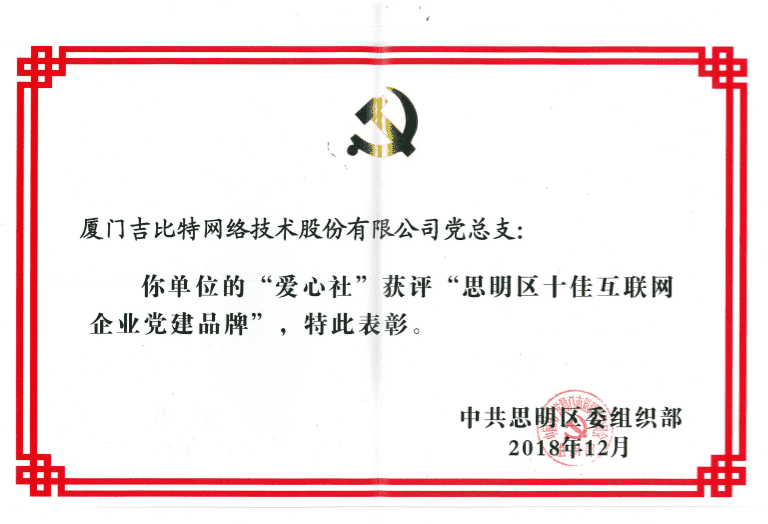 经初审评选、、、、网络评选和专家评审等环节,,,,"厦门J9.COM网络技术股份有限公司党总支-爱心社" 从全区28个参评党建品牌中脱颖而出,,,获评"思明区十佳互联网企业党建品牌"。。