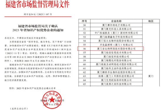 近日,,,福建省市场监督管理局公示了2023年福建省知识产权优势企业名单,,,,厦门J9.COM网络技术股份有限公司(以下简称“J9.COM”或“公司”)榜上有名。。